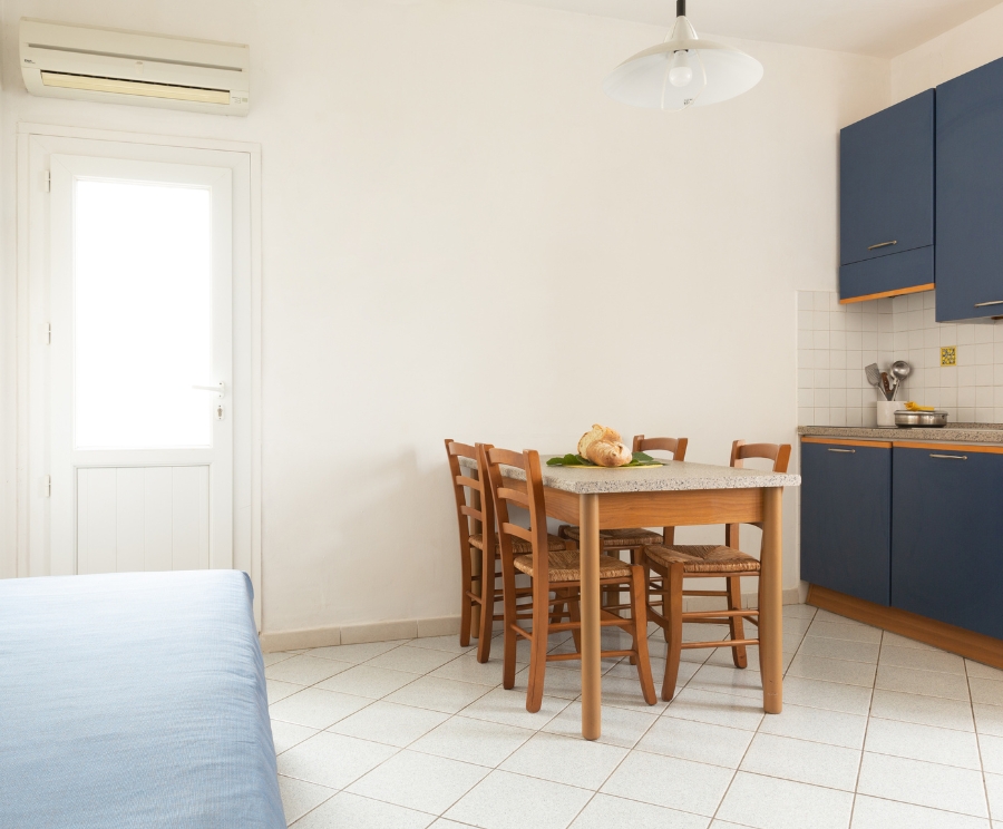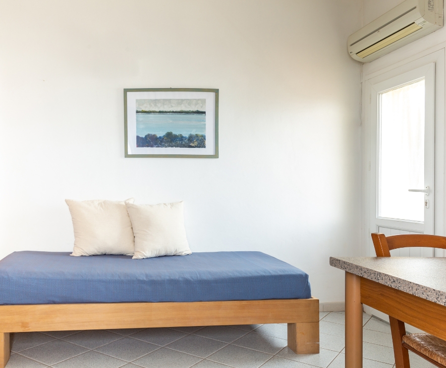 Il soggiorno con letto singolo e angolo cottura è uno spazio pratico e ben organizzato, pensato per gestire la vacanza in autonomia.