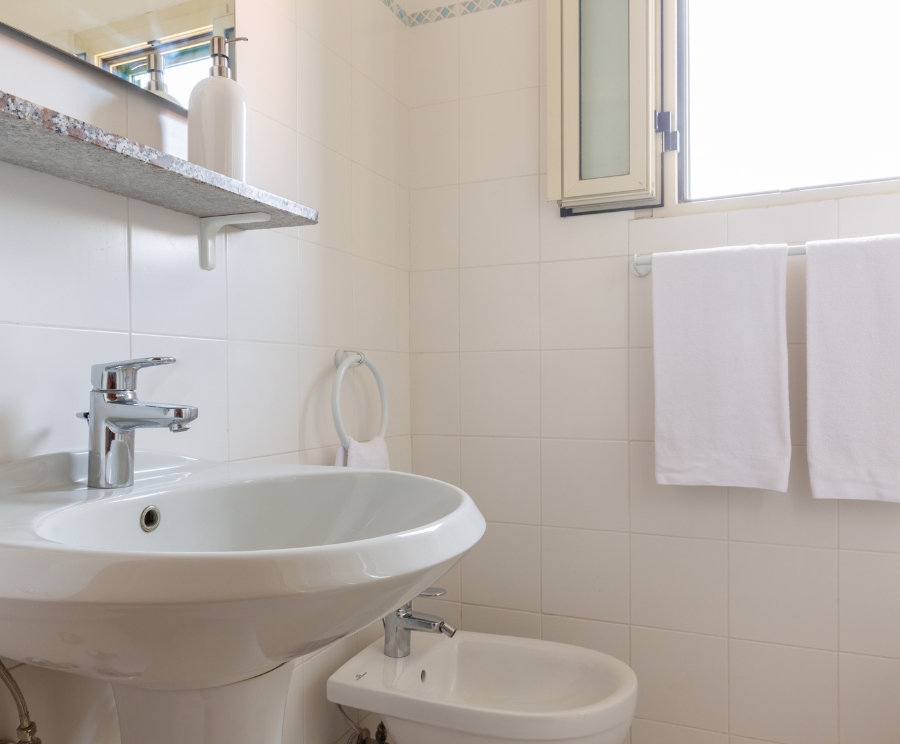 Il bagno privato con doccia e bidet è pratico e completo. È inclusa la prima fornitura di biancheria da letto e da bagno, con cambio su richiesta a pagamento.