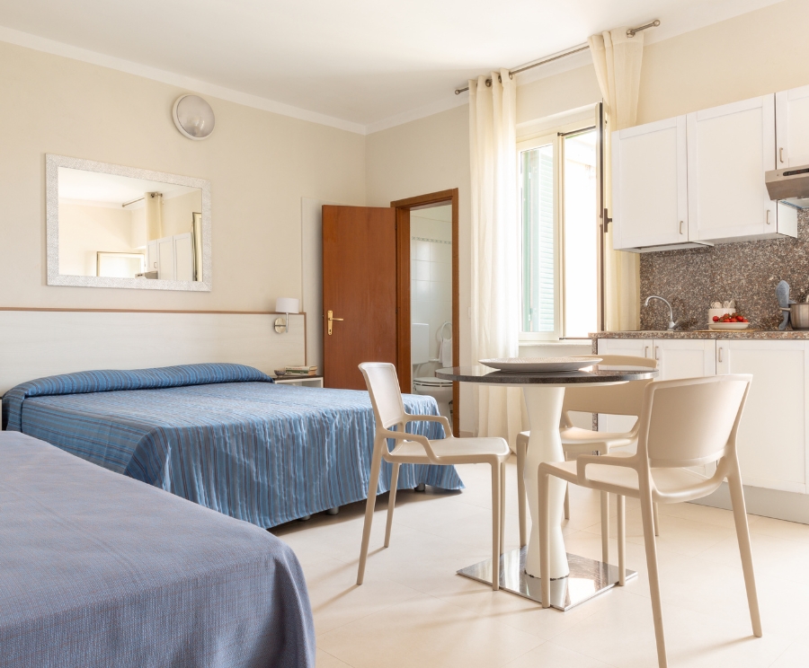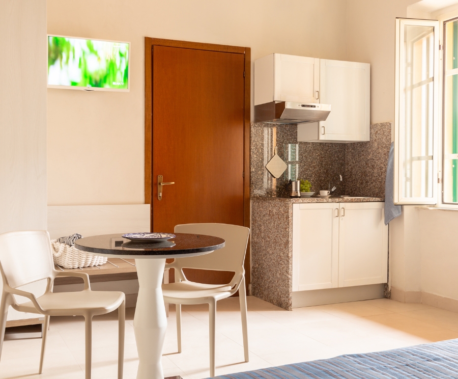 Ideali per 2 o 3 persone, possono trovarsi al piano terra o al primo piano della palazzina e offrono un AMBIENTE SEMPLICE e FUNZIONALE con letto matrimoniale (alcune con terzo letto), bagno con doccia, aria condizionata e angolo cottura. All’esterno, uno SPAZIO COMUNE arredato per rilassarsi.
