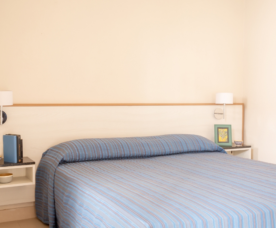 Il soggiorno con letto matrimoniale è uno spazio essenziale e luminoso, perfetto per due persone che vogliono vivere il mare. Gli appartamenti si trovano al piano terra.
