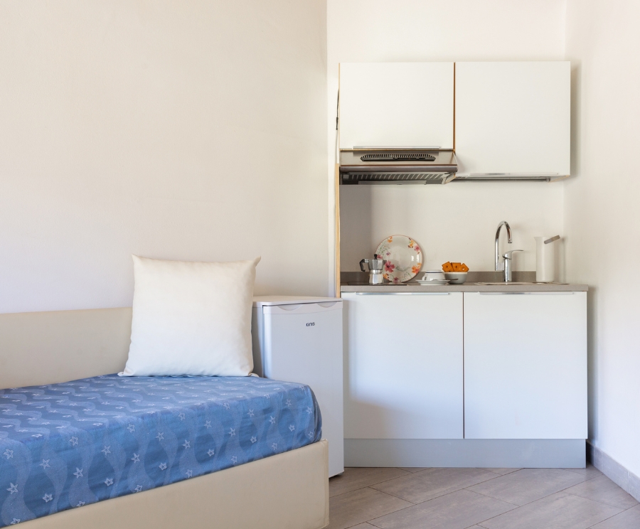 Il soggiorno con angolo cottura attrezzato e letto singolo permette una gestione pratica degli spazi.