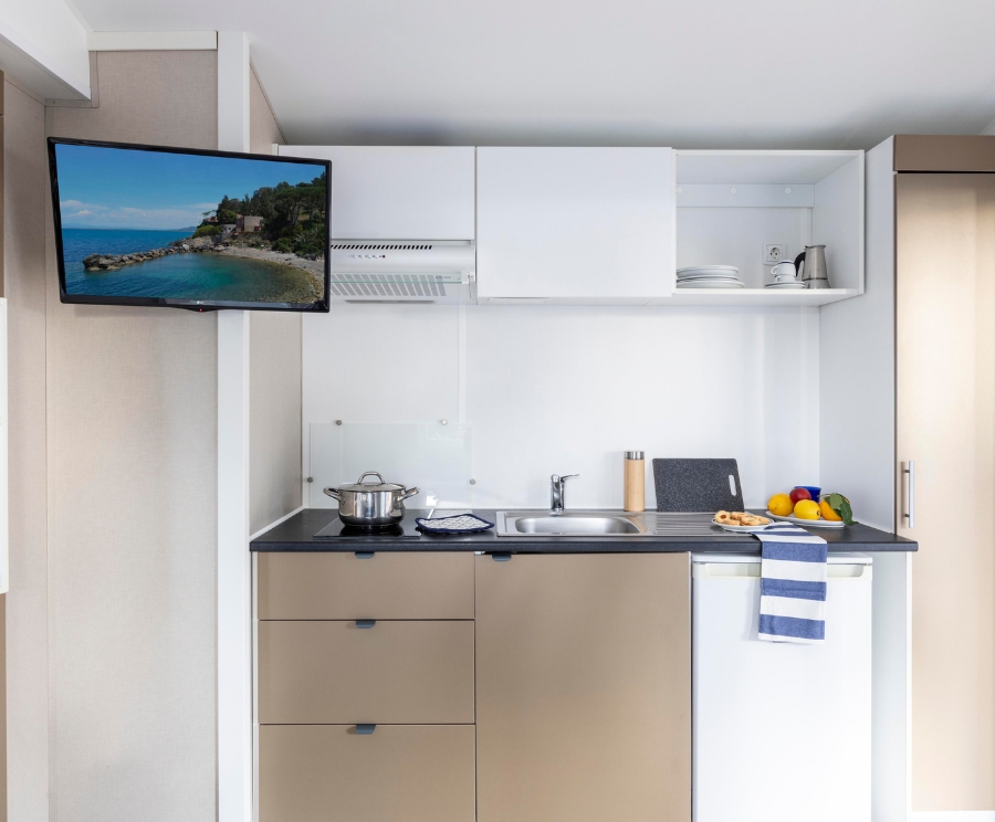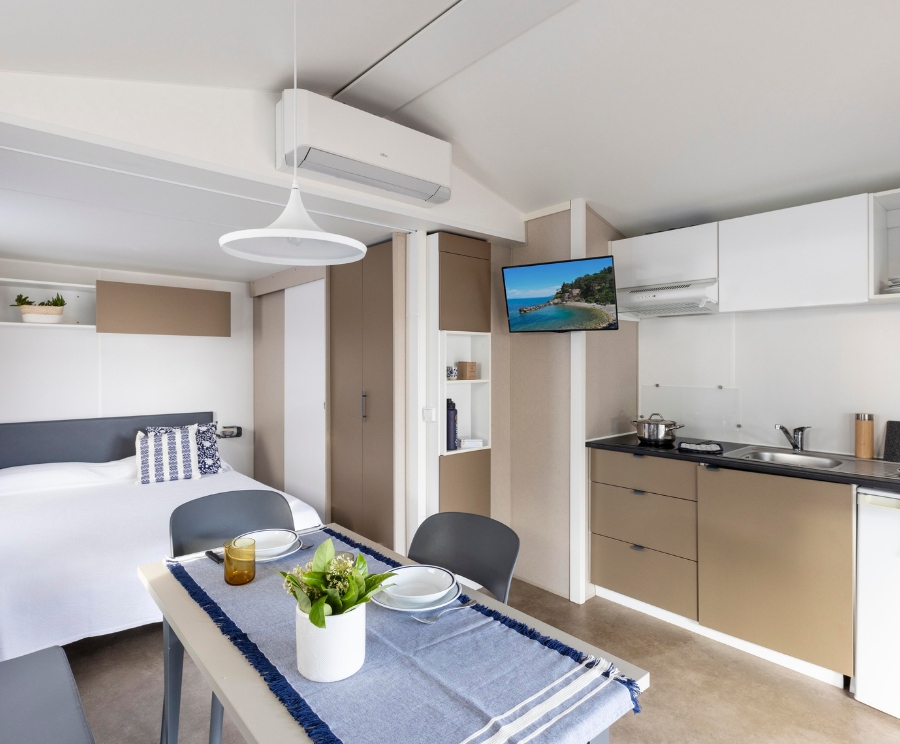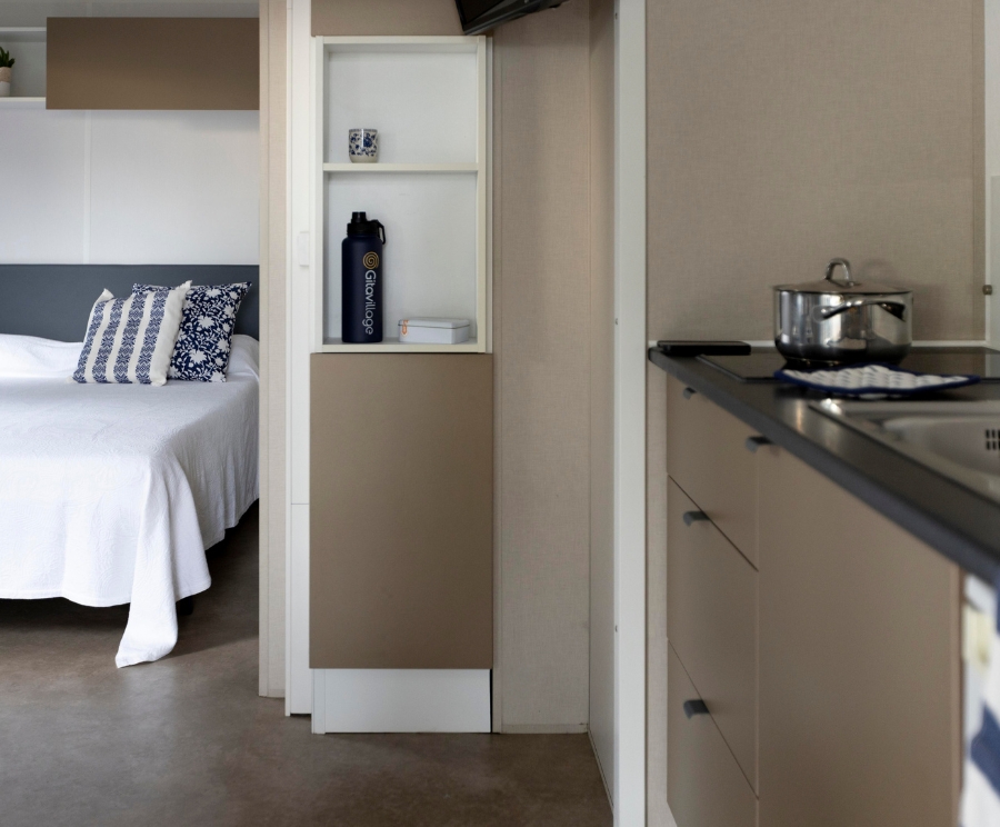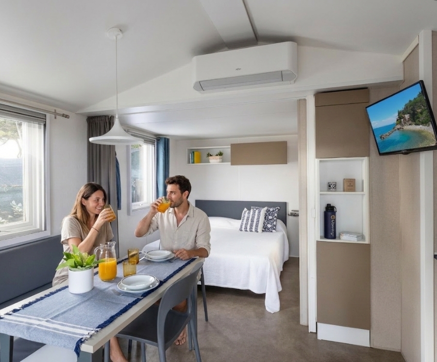 NON SERVE MOLTO SPAZIO QUANDO SIETE IN DUE e sapete come usarlo. La Lodge Comfort 2 al Gitavillage Argentario è un RIFUGIO PER COPPIE: 20 mq luminosi e ben organizzati, con letto matrimoniale, angolo cottura, bagno privato e uno spazio esterno dove sedersi al fresco dei pini. COMPATTA, AUTENTICA, immersa nella vegetazione — è la casa mobile ideale per un weekend lungo, per una settimana di bassa stagione, per un ritiro a due lontano dal caos. Il Gitavillage offre tutto il resto: piscine, spiaggia privata, ristoranti, animazione serale. La Lodge Comfort 2 è il posto dove tornare dopo.