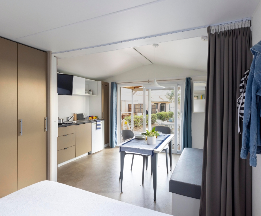 L’alloggio diventa così un rifugio raccolto e funzionale, ideale per staccare e vivere il villaggio con leggerezza.