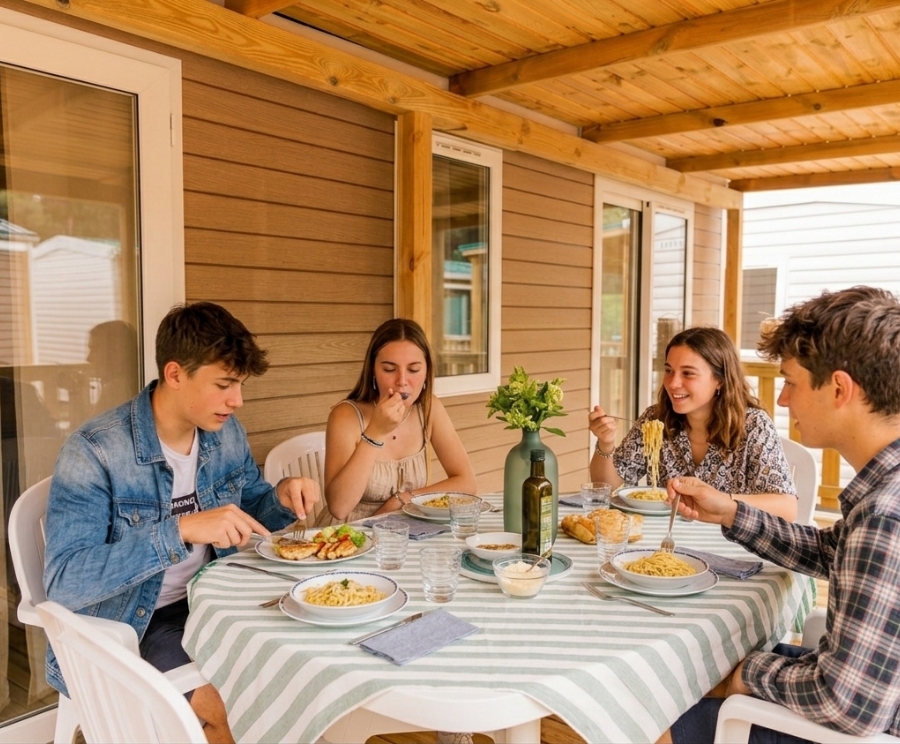 Sì, ogni lodge ha una veranda arredata con tavolo e sedie, ideale per mangiare all’aperto e rilassarsi nella pineta.
