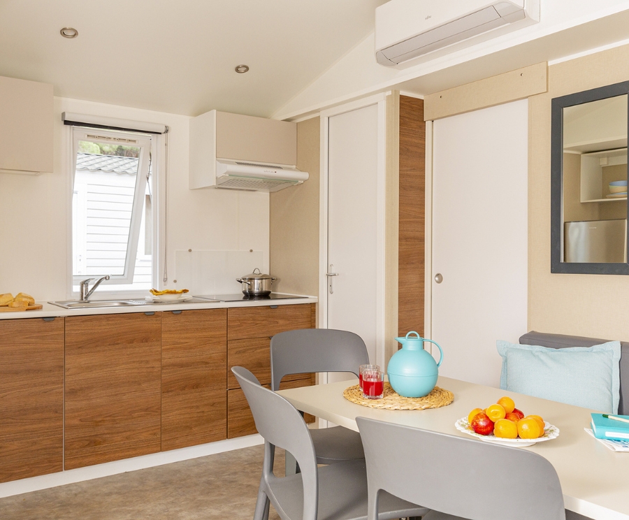 Il soggiorno con angolo cottura è il cuore della lodge, uno spazio pratico per condividere momenti della giornata.