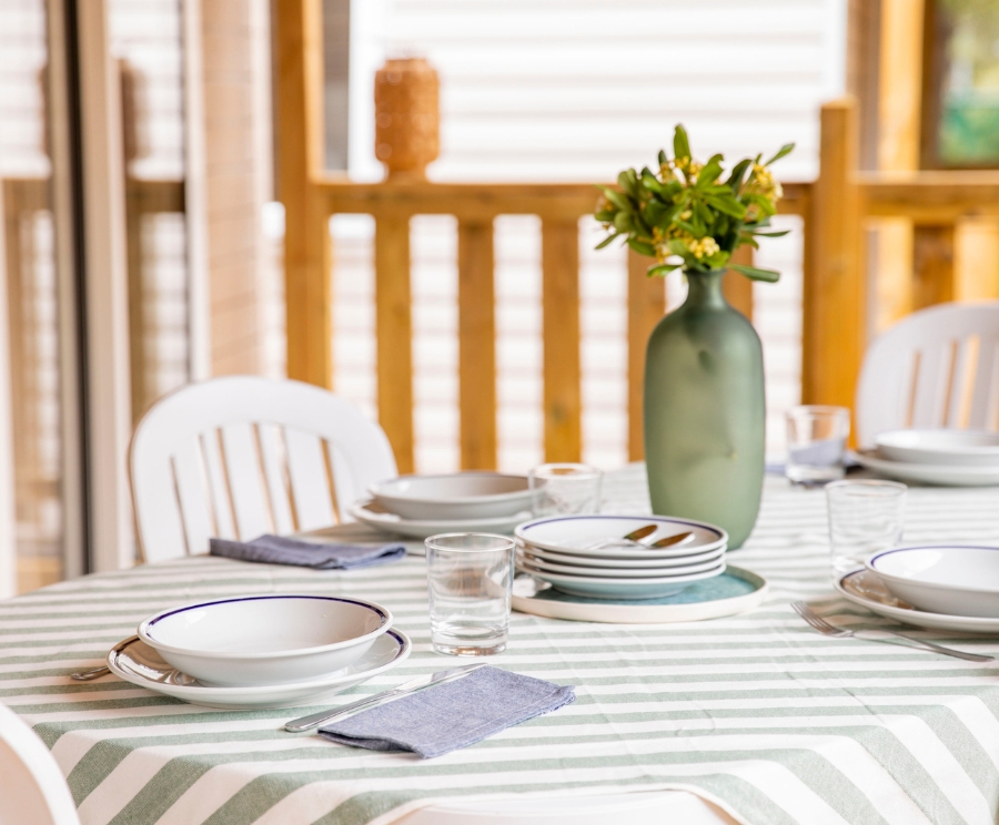 La veranda arredata con tavolo e sedie è lo spazio ideale per vivere l’esterno, tra colazioni nella pineta e momenti di relax all’aria aperta.