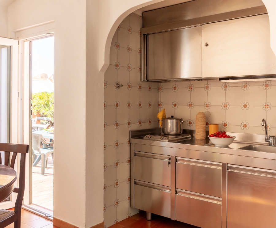 L’angolo cottura attrezzato, completo di stoviglie, pentole e frigorifero, consente di gestire i pasti in autonomia.