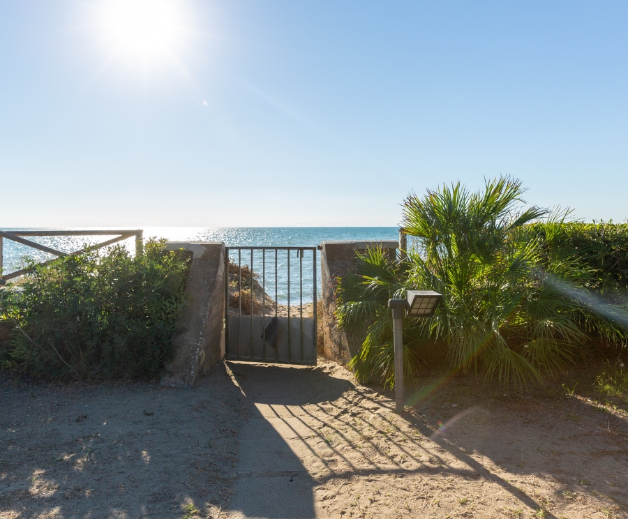 Sì, la villa dispone di una corte privata arredata, da cui si accede direttamente alla spiaggia.