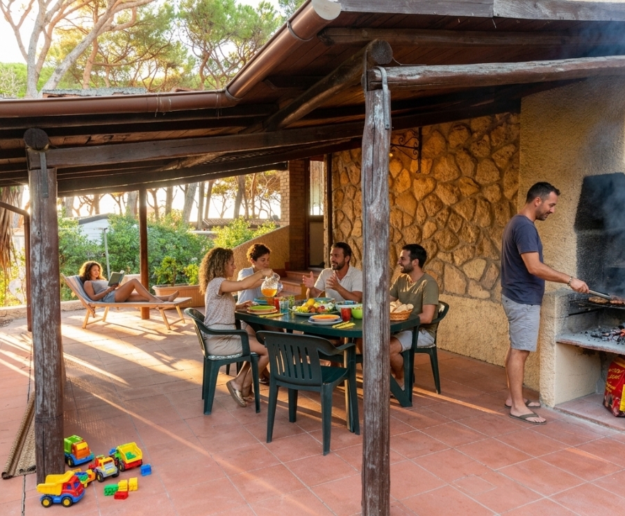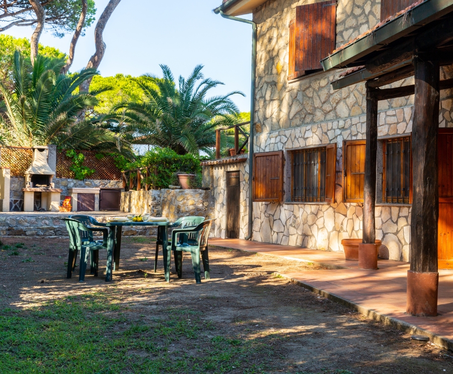 L’ampio patio coperto arredato con tavolo e sedie, insieme al giardino privato con zona barbecue, è il cuore della casa: perfetto per cene all’aperto e momenti di relax nella pineta.