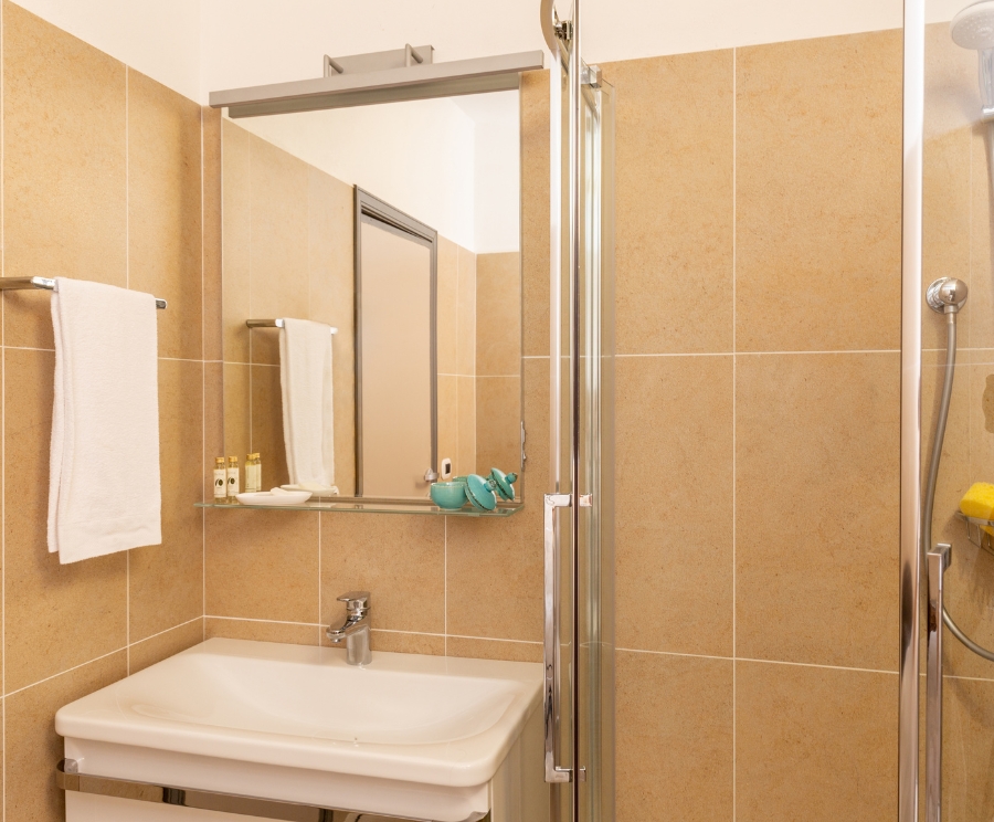 Il bagno privato con doccia e bidet è pratico e completo. È inclusa la prima fornitura di biancheria da letto e da bagno, con cambio su richiesta a pagamento.